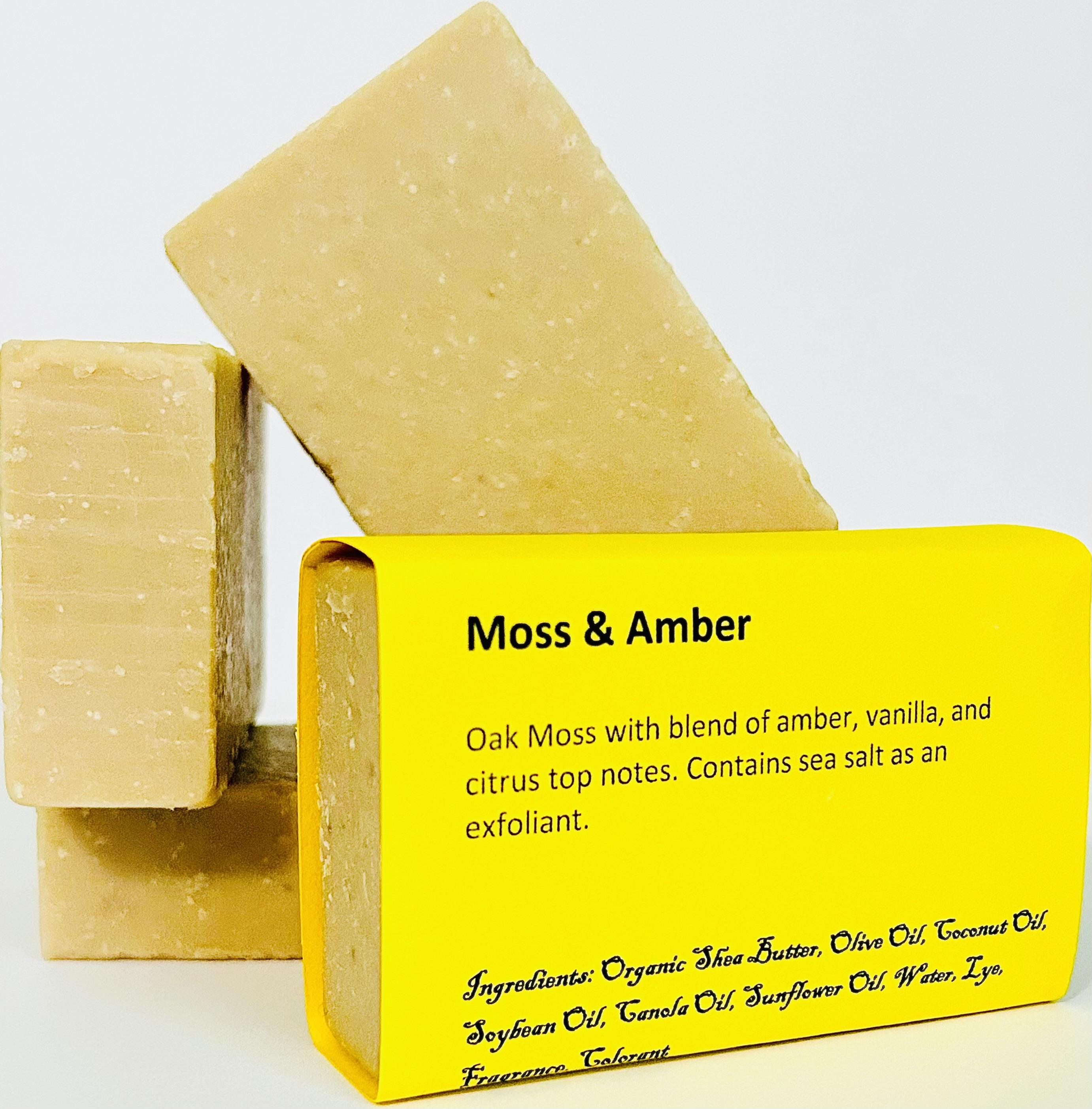 Oak Moss with blend of amber, vanilla, and citrus top notes. Contains sea salt as an exfoliant.