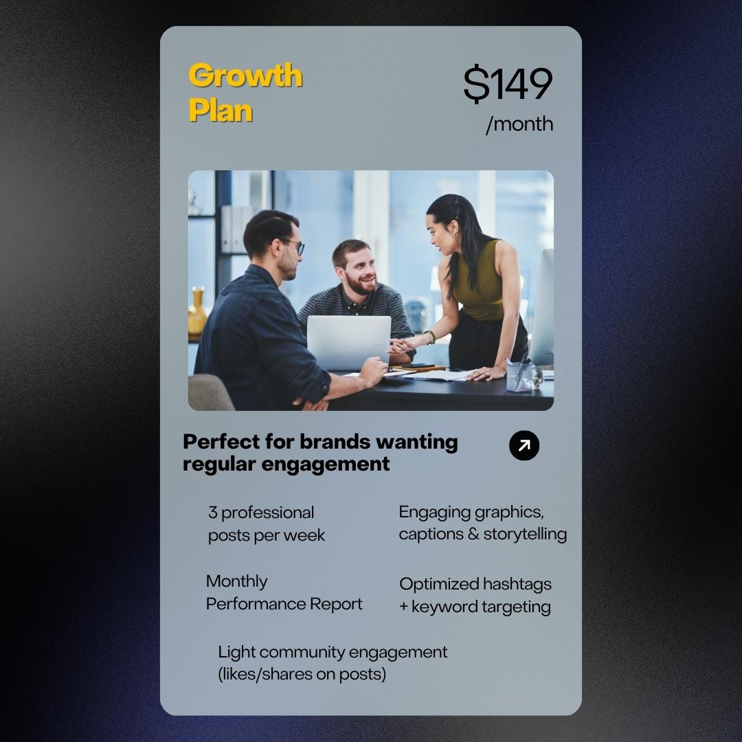 Growth Plan ($149/month): Recommended for brands seeking consistent engagement, featuring three posts per week, monthly performance reports, optimized hashtags, and light community interaction.